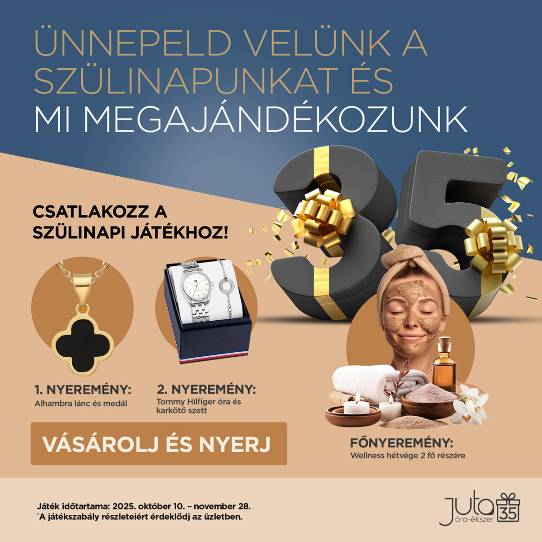 A Juta Óra–Ékszer 35 éve a magyar ékszerpiac egyik meghatározó szereplője. Egy családi vállalkozás, amely generációkon át őrzi a minőség, elegancia és gondoskodás értékeit. Az első, Kígyó utcai ékszerbolt megnyitásától kezdve a modern, országos hálózatig a Juta története a kitartásról, megújulásról és emberi kapcsolatokra épülő márkáról szól. Most, a 35. születésnap alkalmából visszatekintünk az elmúlt évtizedek meghatározó pillanataira – üzletekre, arcokra és közös élményekre, amelyek ma is a Juta ragyogását adják.