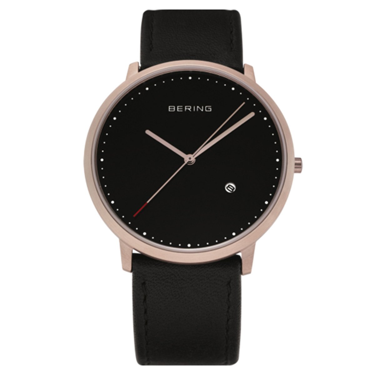 Bering férfi óra, tok anyaga nemesacél, színe rose-gold, a szíj anyaga bőr és a színe fekete. Az óratok átmérője 39mm, üvege zafír kristály, szerkezete kvarc és vízállósága 30 m. Az órára 3 év magyar és nemzetközi garancia érvényes.