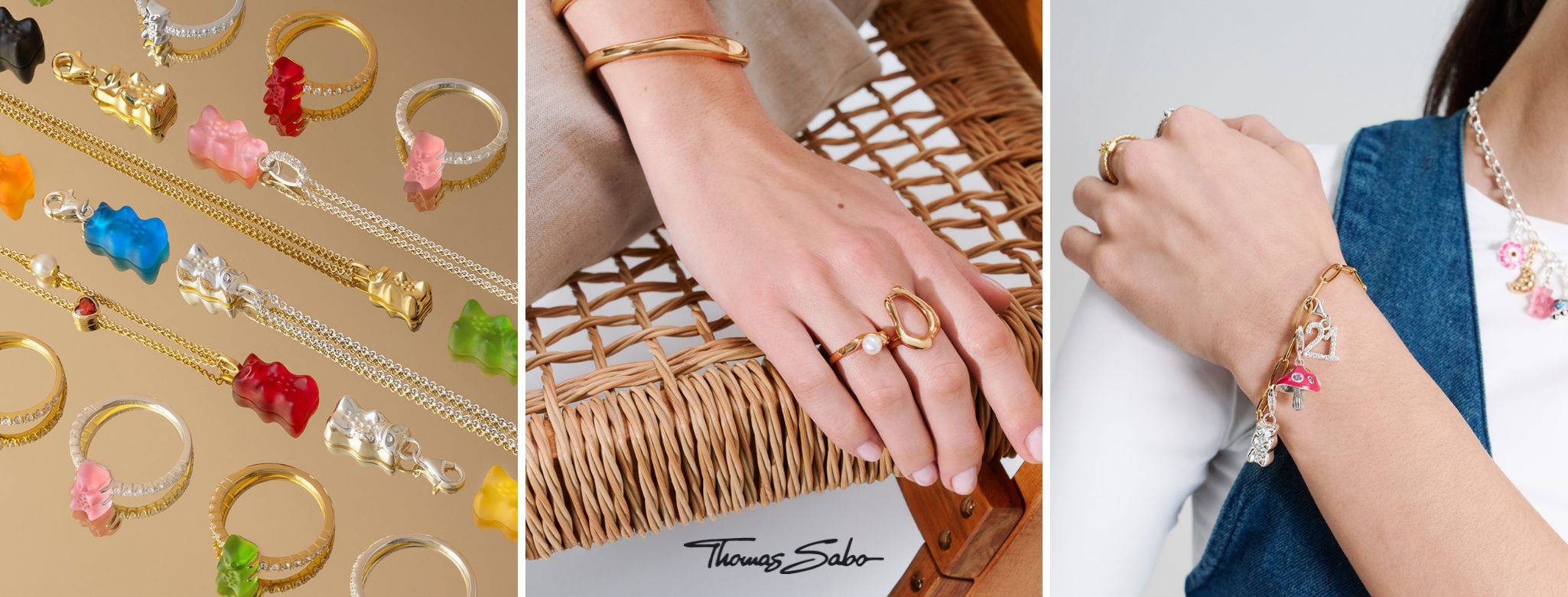 A Thomas Sabo charm hordozó karkötő egyszerűbb. A legtipikusabb a függő charm (a legdominánsabb típus), ehhez társulnak a 3D-s figurális charmok. Mindenki ismeri a Charmista klub ikonikus Thomas Sabo-stílusú ezüst charmokat, az köves, statement darabokat, a zománcos, színes charmokat - amilyen a Smiley kollekció. Az egyik legkülönlegesebb Thomas Sabo kollekciót se hagyjuk ki, a Haribo kollekciót.