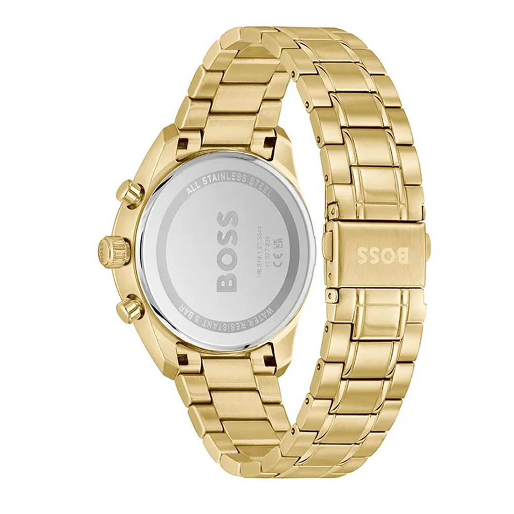 BOSS GRAND PRIX 40 karóra 5 BAR nyomásig alapszinten vízálló, sárga arany színű nemesacél tokkal, ásványi kristályüveggel, aranyszínű tömör szemekből álló nemesacél csattal, nyitáskönnyített csatközéppel készül. Az órát pontos quartz óraszerkezet működteti, mely elemmel működik. Az óráról a pontos idő mellett leolvasható a nap is, stopper funkcióval, mely részidős mérést is lehetővé tesz.