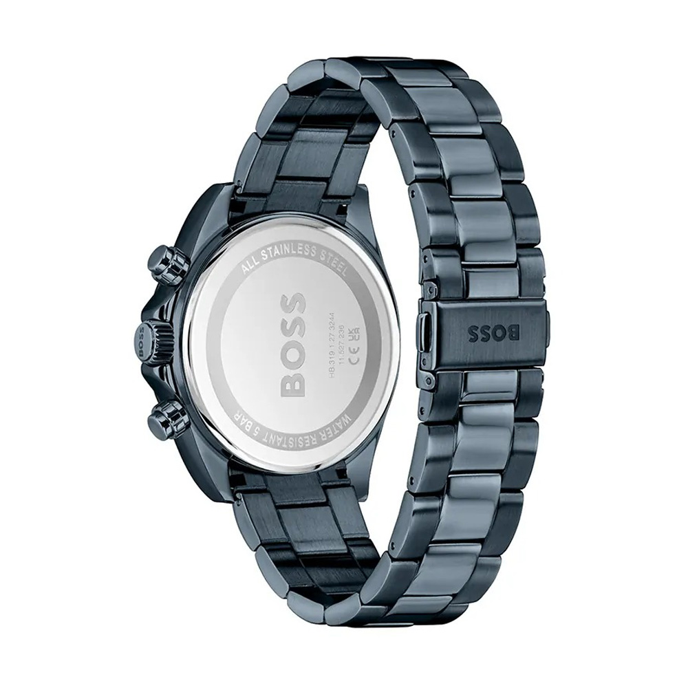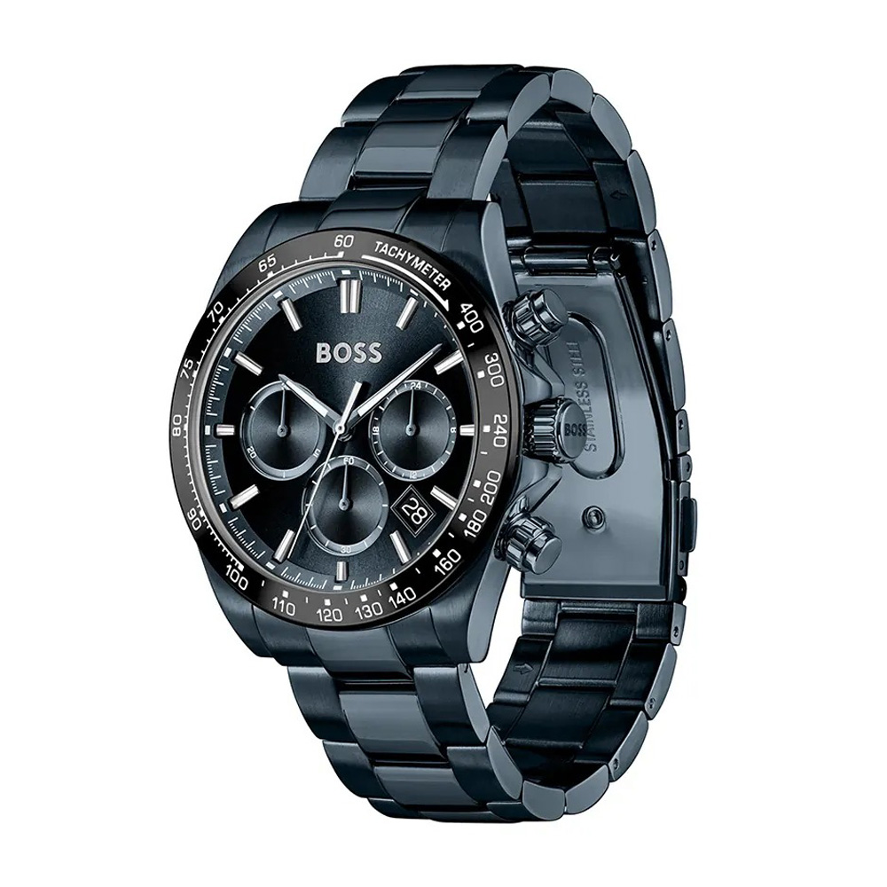 BOSS HERO 2_0 karóra 5 BAR nyomásig vízálló, éjkék színű nemesacél tokkal, ásványi kristályüveggel, éjkék színű nyitáskönnyített békazáras csatközéppel készül. Az órát pontos quartz óraszerkezet működteti, mely elemmel működik. Az óráról a pontos idő mellett leolvasható a nap is.