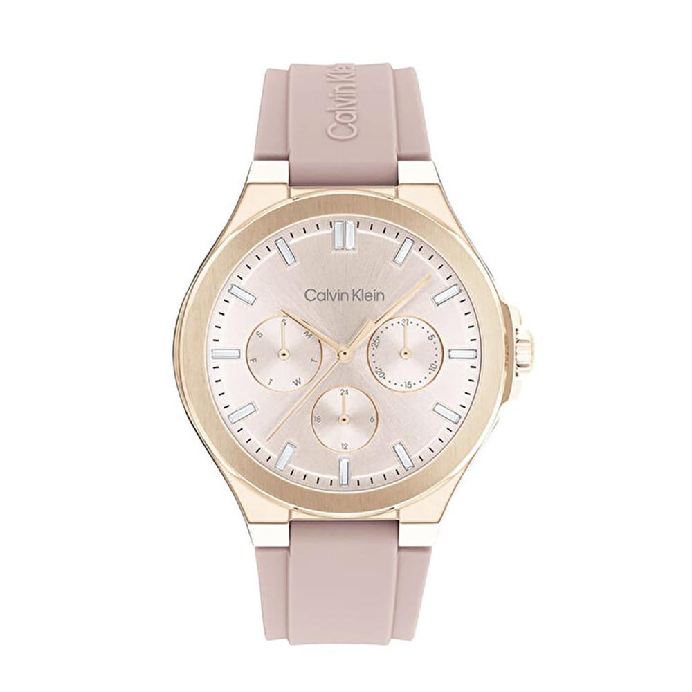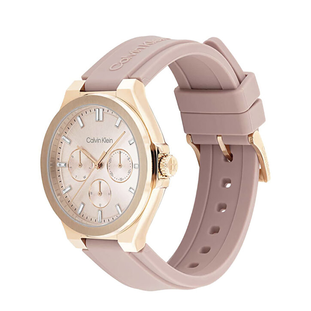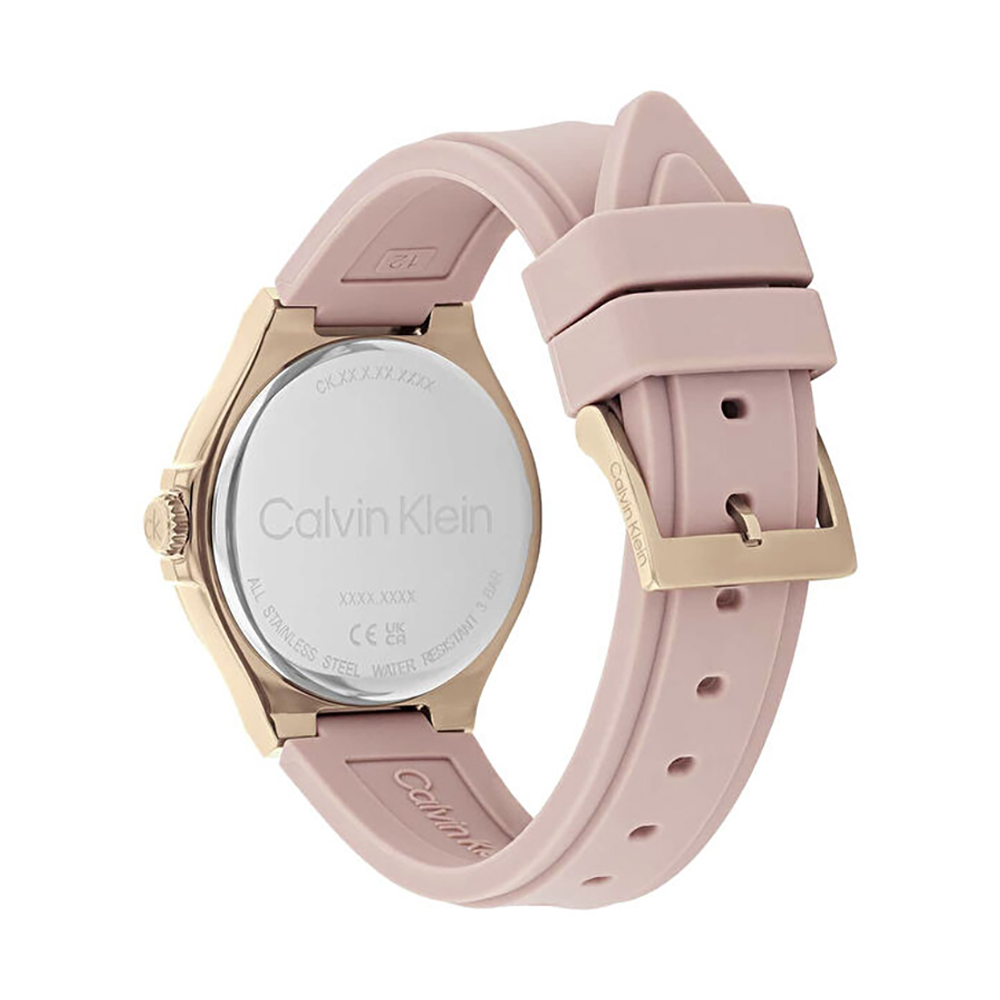 A Calvin Klein Vibrancy női karóra cseppálló, rozéarany színű nemesacél tokkal, ásványi kristályüveggel, rózsaszinű műanyagszíjjal készül. Az órát pontos quartz óraszerkezet működteti, mely elemmel működik (kb. 3 év az elem várható élettartama). Az óráról a pontos idő mellett leolvasható a nap, a nap neve és a 24-órás mutatóról a napszak is.