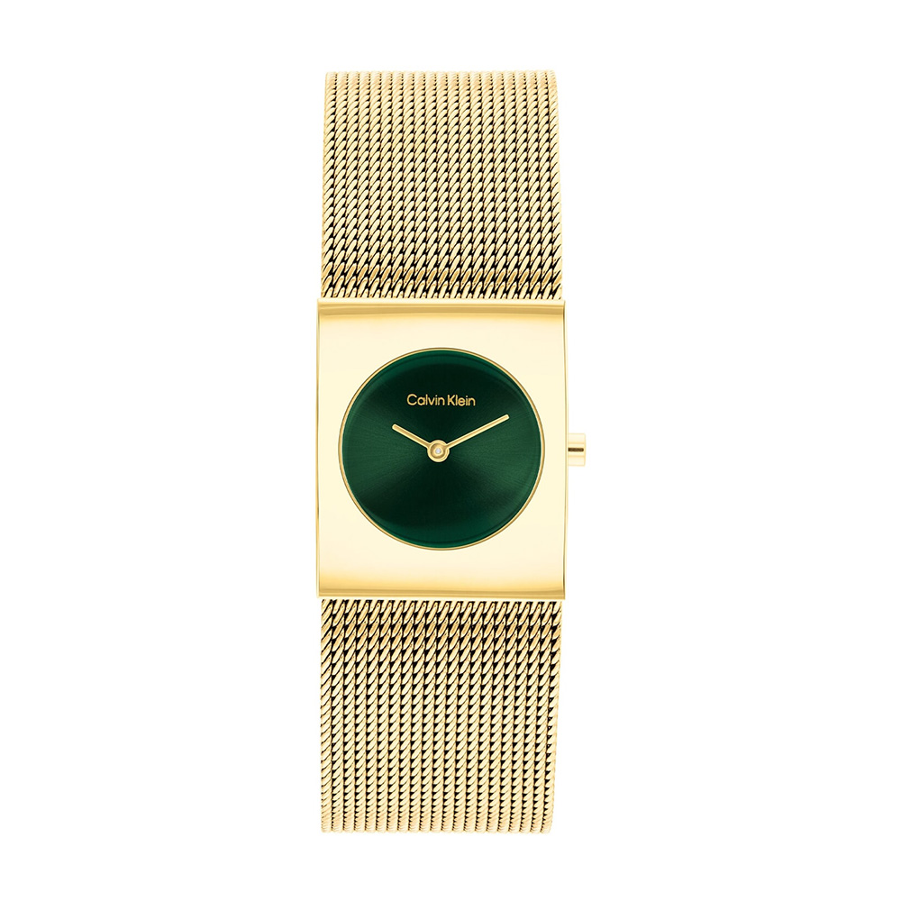 A CALVIN KLEIN CK PULSE női karóra cseppálló (3ATM), sárga arany színű nemesacél tokkal, ásványi kristályüveggel, sárga arany színű csúszós csatközéppel készül. Az órát pontos quartz óraszerkezet működteti, amely elemmel működik. Emellett a karóra szögletes tokkal és zöld színű számlappal rendelkezik.