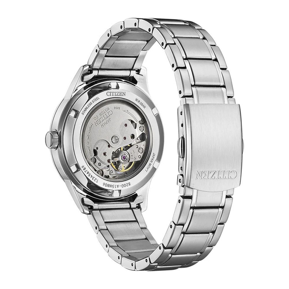 A CITIZEN AUTOMATIC NY4058-79L karóra 5 BAR nyomásig vízálló, ezüst színű nemesacél tokkal, ásványi kristályüveggel, átlátszó hátlappal, ezüst színű békazáras acélcsattal készül. A mechanikus szerkezetet egy rugó működteti, melyet a kéz mozgása húz fel automatikusan. A megbízható működés eléréséhez kb. 8 óra aktív mozgásra van szükség. Az óráról a pontos idő mellett leolvasható a nap neve is.