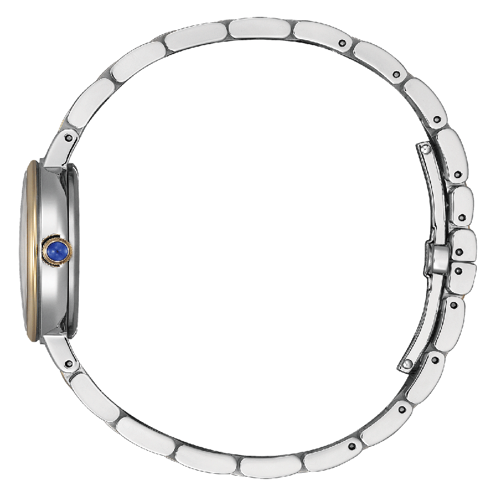 A CITIZEN ELEGANCE LADY karóra 5 BAR nyomásig alapszinten vízálló, bicolor nemesacél tokkal, domború zafír kristályüveggel, bicolor nemesacél csattal, gyöngyház színű számlappal, nyitáskönnyített pillangózáras csatközéppel készül. Az órát az Eco-Drive rendszernek köszönhetően kizárólag a fényből nyert energia működteti