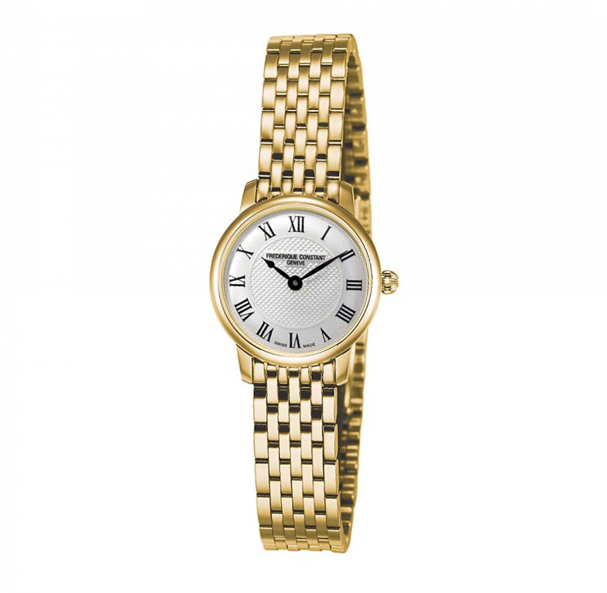 Frederique Constant női óra, tok anyaga nemesacél, színe arany, a szíj anyaga nemesacél és a színe arany. Az óratok átmérője 25mm, üvege zafír kristály, szerkezete kvarc és vízállósága 30 m. Az órára 2 év magyar és nemzetközi garancia érvényes.