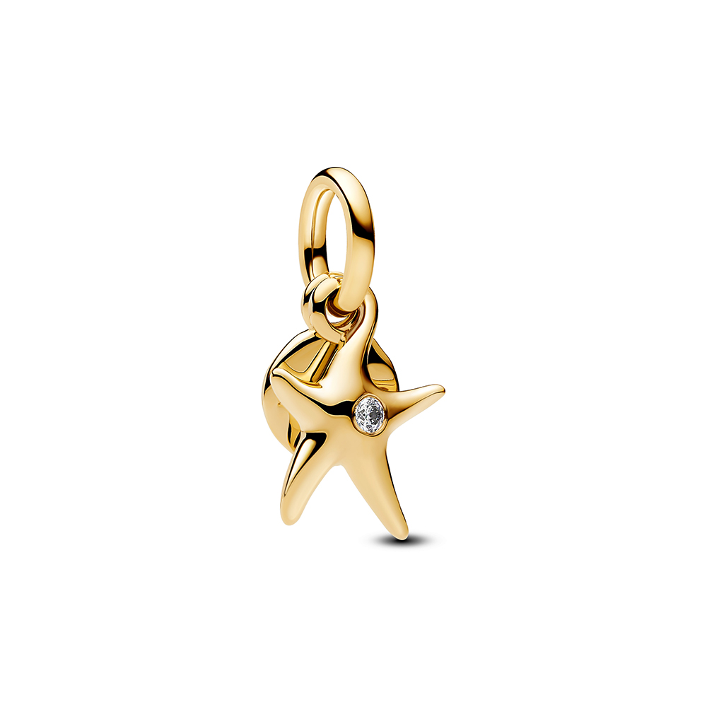 Dupla függő charm, 14 karátos arannyal futtatva, mely egy részletesen kidolgozott tengeri csillag motívumból (apró cirkónia kővel díszítve, amely szikrázó hatást kelt) és egy kis kerek lapból áll. Nyári hangulatot idéző ékszer, amely a tengerparti élmények, a szabadság és a természet szépsége előtt tiszteleg.