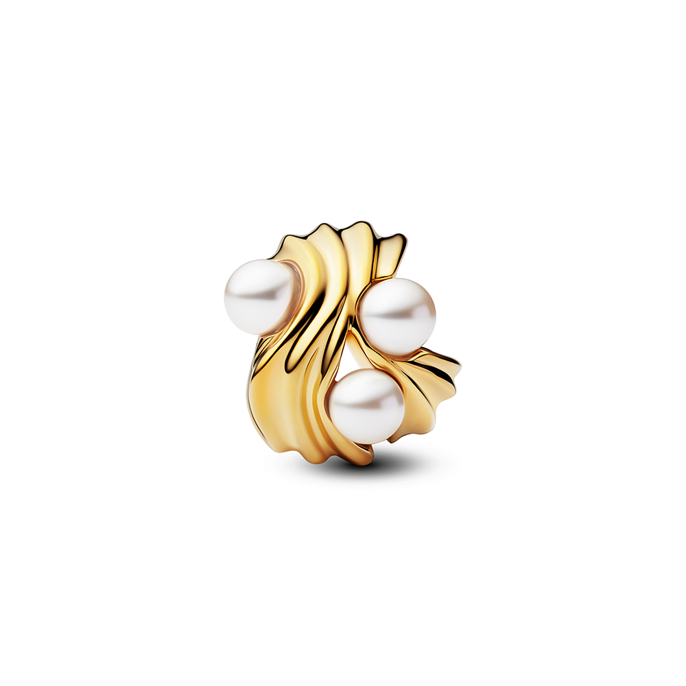 Absztrakt, hullámokat idéző formavilágú, 14 karátos arannyal futtatott, fehér lakkozott mesterséges gyöngyökből készült fix charm. Modern, művészi megjelenésű darab, amely a természet és az elegancia találkozását képviseli. A hullám motívum az élet áramlását, a természet erejét és a belső harmóniát szimbolizálja.
