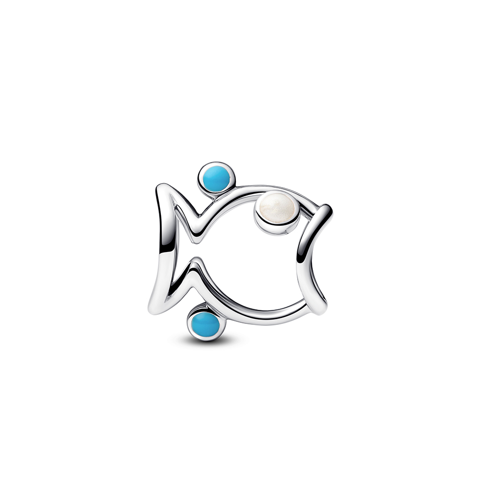 A tenger ihlette Pandora kollekciók egyik figyelemre méltó darabja. Áttört (openwork) dizájn, vagyis a hal teste nyitott, ettől a charm könnyed és légies hatást kelt. Csillogó fehér és türkiz tűzzománccal díszített. A halak gyakran a rugalmasság, az áramlás és belső erő, bőség jelképei.