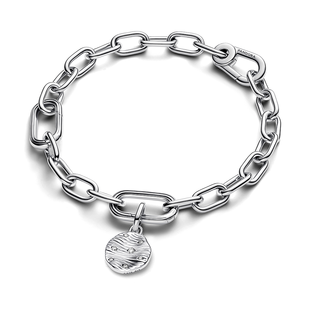 Kerek formájú, egyik oldalán letisztult felületű, gravírozható mini charm. Áttetsző cirkóniával díszített, sterling ezüstből készült ékszer, mely minimalista dizájnjával jól illeszkedik bármilyen stílusú karkötőhöz.