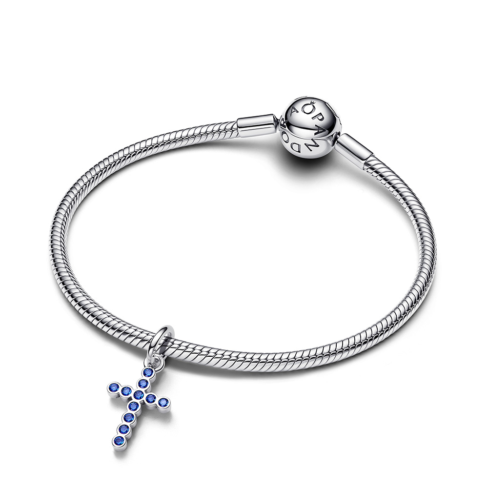 Ez az elegáns függő charm a kereszt motívumot ábrázolja, amely a hit, a remény időtlen szimbóluma. Klasszikus formáját finoman kidolgozott részletek emelik ki, így egyszerre sugároz letisztultságot és mély jelentést.A charm sterling ezüstből készült, és függő kialakítása révén szabadon mozdul a karkötőn vagy nyakláncon, elegáns dinamizmust adva az összeállításnak.