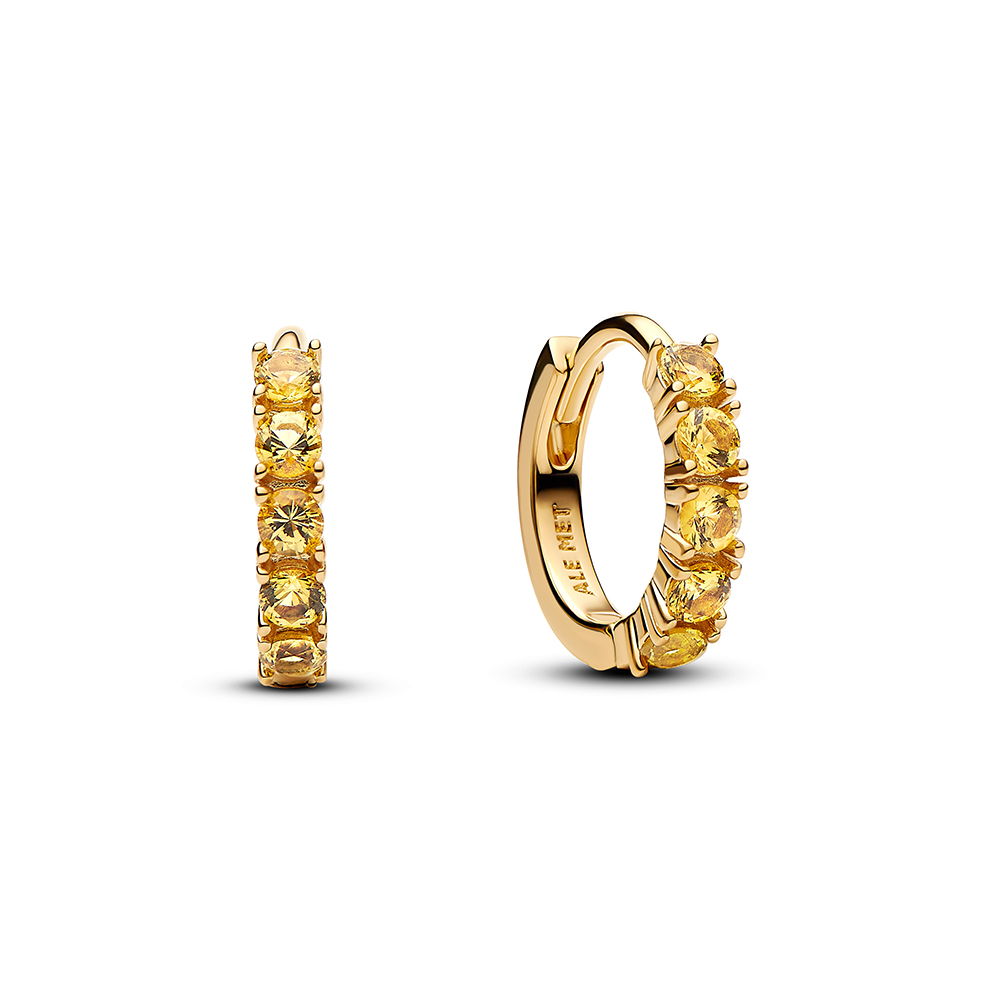 Egy letisztult, modern stílusú aranyszínű ékszer, amely tökéletesen ötvözi az eleganciát és a hétköznapi viselhetőséget. „Huggie” típusú karika fülbevaló, ami azt jelenti, hogy szorosan „öleli” a fülcimpát. 14 karátos arannyal futtatva, sárga színű kristályokkal díszítve tökéletes választás akár mindennapi használatra is.