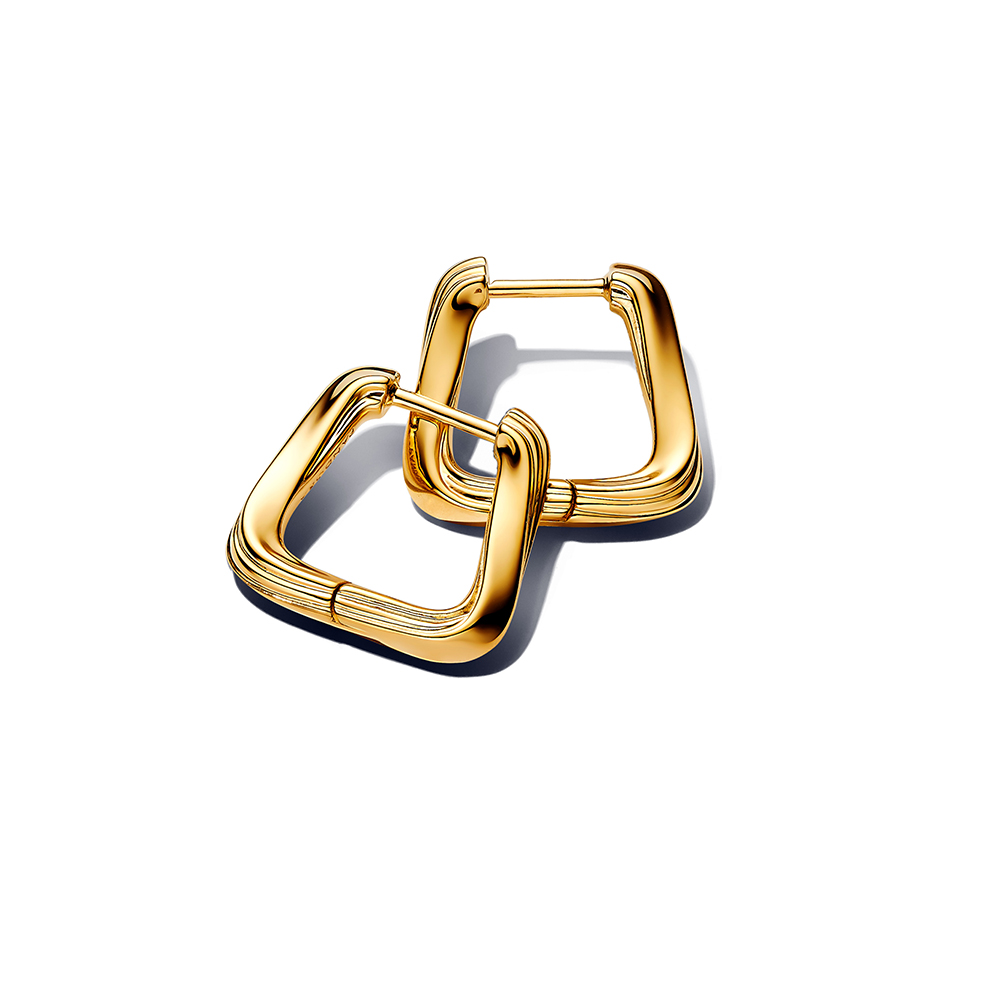 A Pandora egyik modern, geometrikus inspirációjú ékszere, amely elegáns arany tónusban pompázik, mégis egy csipetnyi kreativitást csempész a klasszikus karikafülbevaló stílusába. 14 karátos arannyal futtatva, kő nélküli kialakításban, háromszög alapformára csavart dizájnban pompázik.