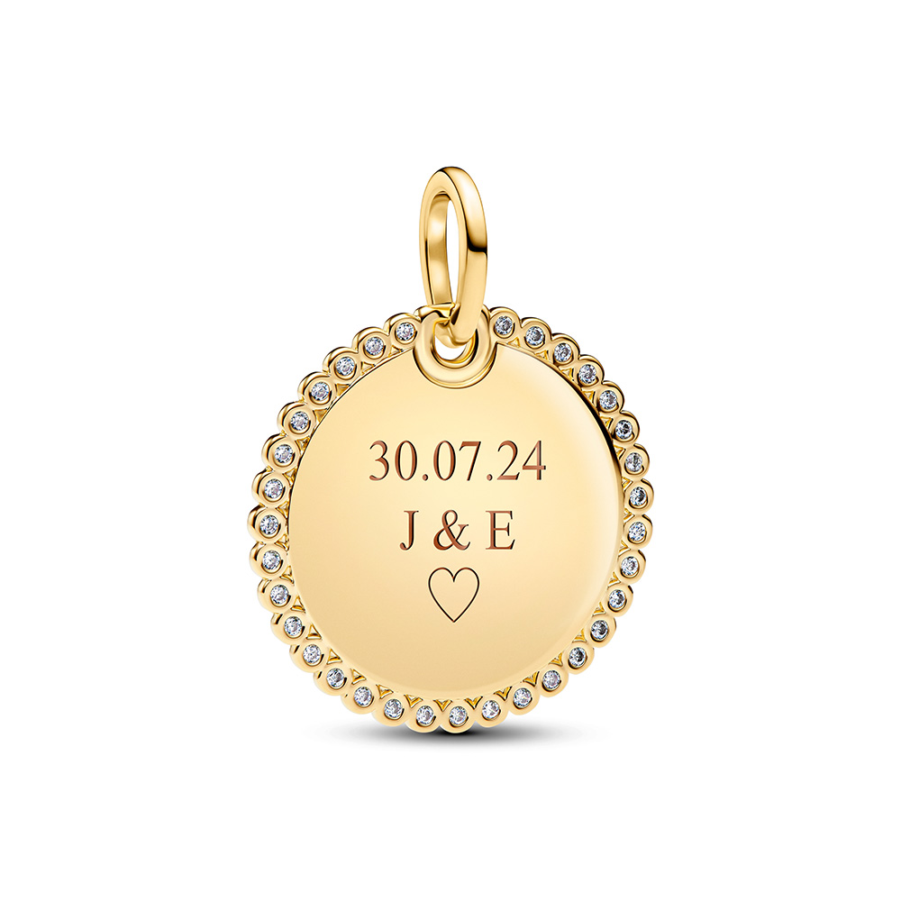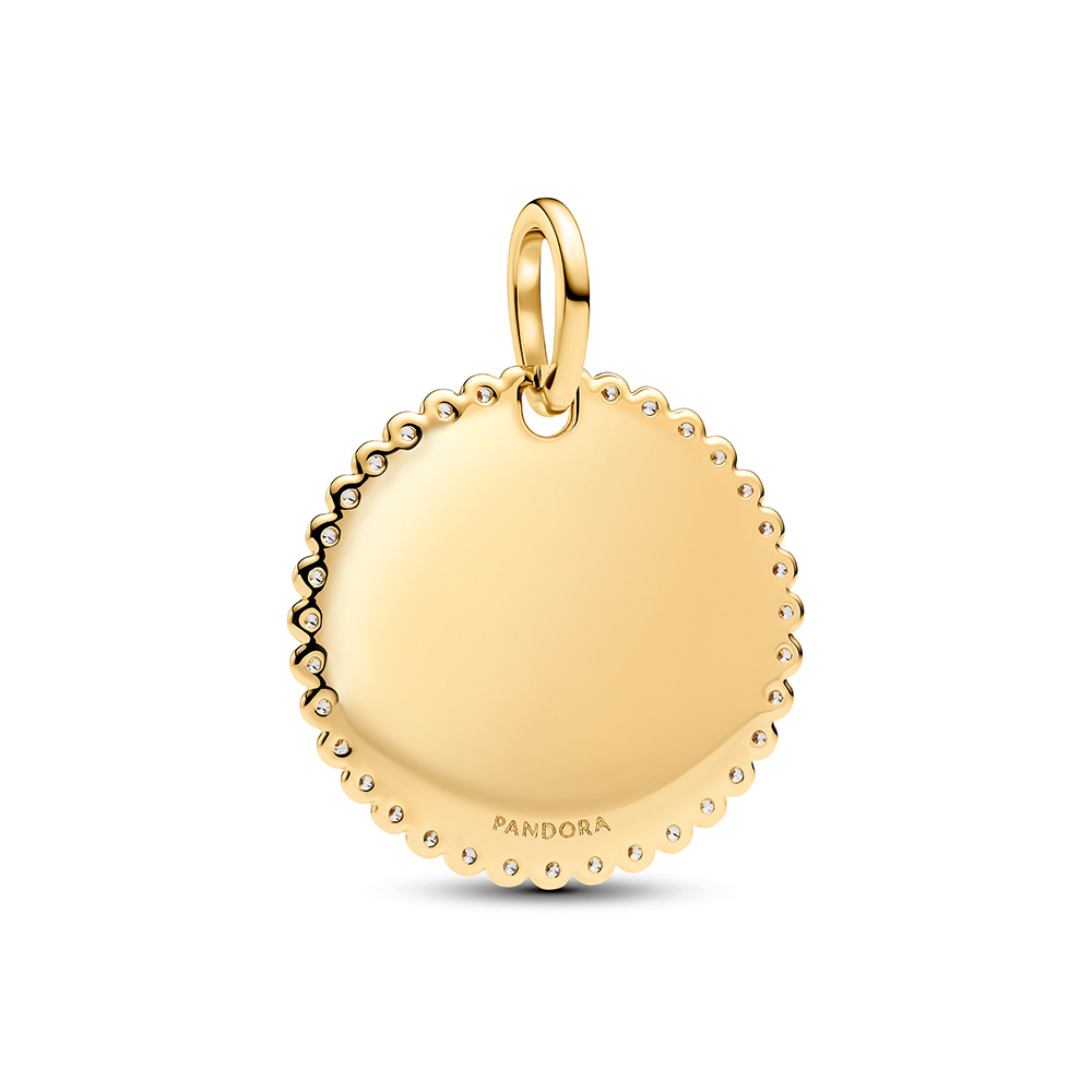 Ez a Pandora medál klasszikus, letisztult stílusban készült, amelyet a személyre szabhatóság tesz igazán különlegessé. A 14karátos arannyal bevont, kiváló minőségű fémötvözetből kialakított, kerek formájú függőmedál sima, fényes felülettel rendelkezik, amely lehetővé teszi egyedi gravírozás készítését.