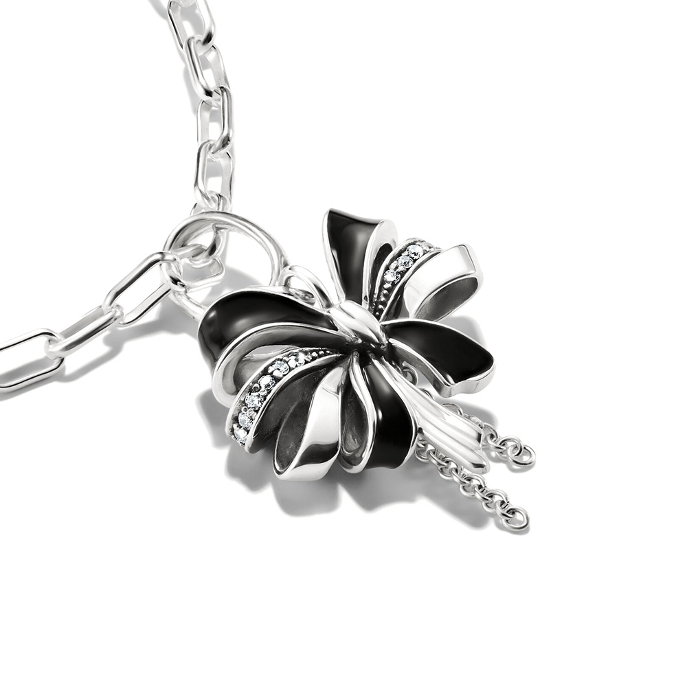 A masni szimbólum a nőiességet, bájt és finomságot fejezi ki. 925-ös sterling ezüstből készült, fekete zománcbevonattal díszítve, amely kiemeli a masni formáját és kontúrjait.