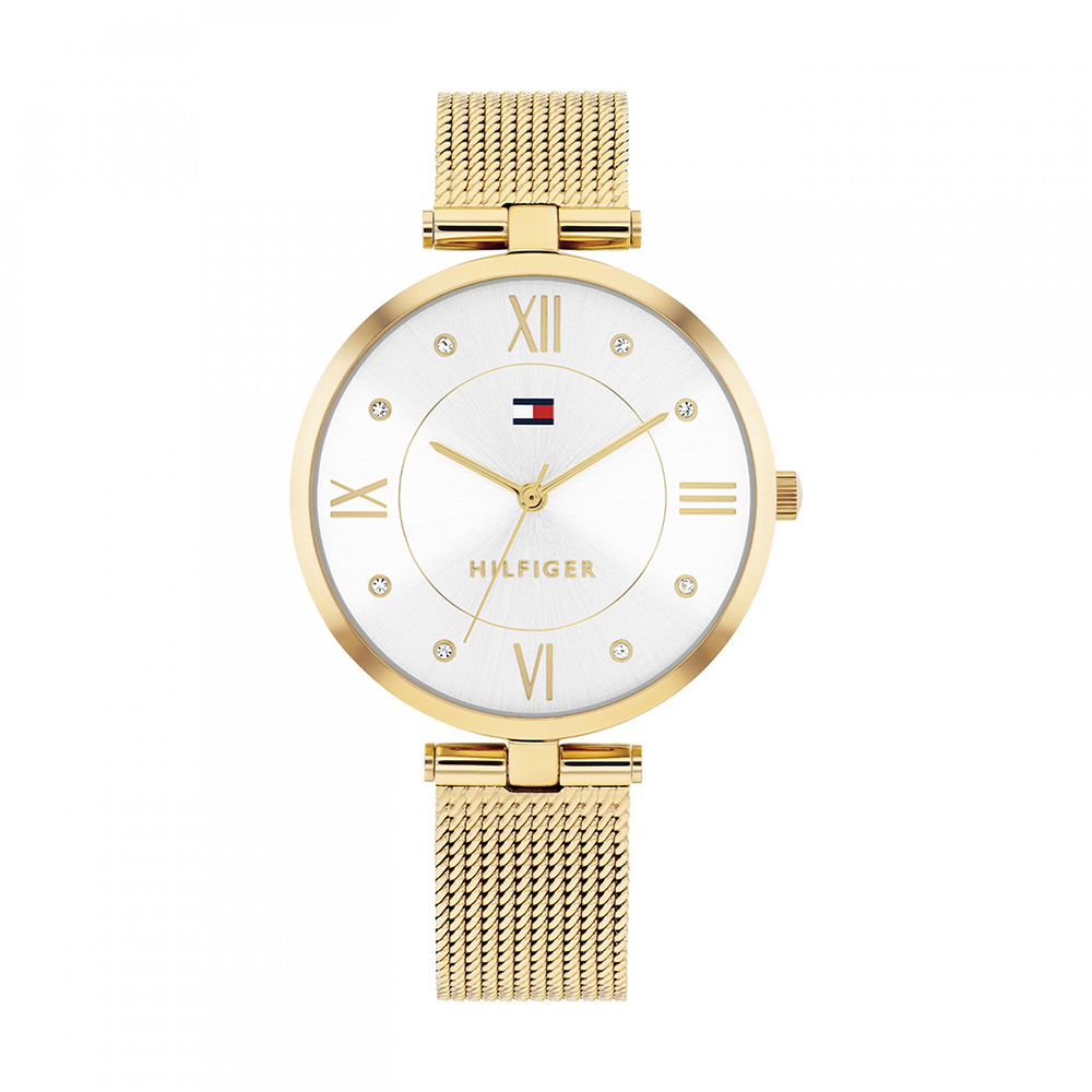 Tommy Hilfiger Ella női karóra cseppálló, sárga arany színű nemesacél tokkal, ásványi kristályüveggel, sárga arany színű békazáras csattal készül. Az órát pontos quartz óraszerkezet működteti, amely elemmel működik. Emellett a karóra kerek tokkal és fehér színű számlappal rendelkezik.