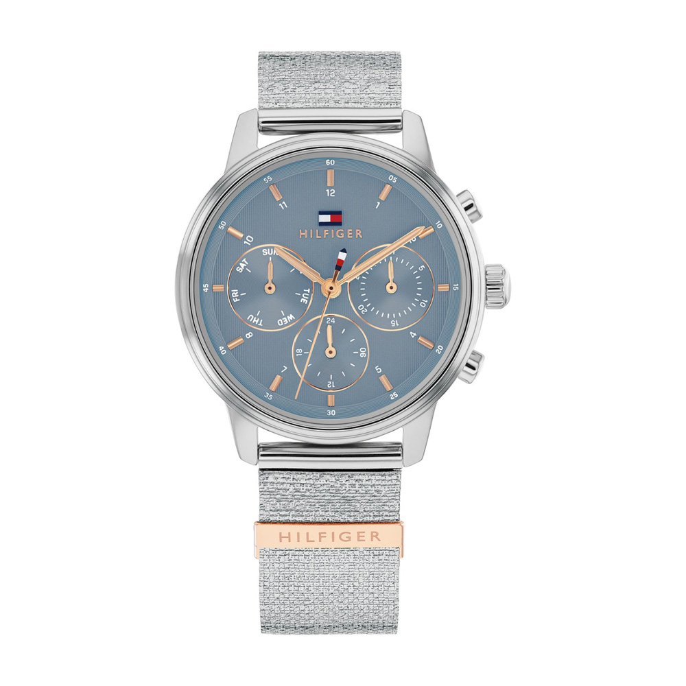 Tommy Hilfiger Blake Mini női karóra cseppálló, ezüst színű nemesacél tokkal, ásványi kristályüveggel, ezüst színű csúszós csatközéppel készül. Az órát pontos quartz óraszerkezet működteti, amely elemmel működik. Emellett a karóra kerek tokkal és kék színű számlappal rendelkezik. Az óra segédszámlapjairól leolvasható a nap és a nap neve valamint a 24-órás segédmutatóról a napszak is. A külön segédszámlapról leolvasható a nap neve is.
