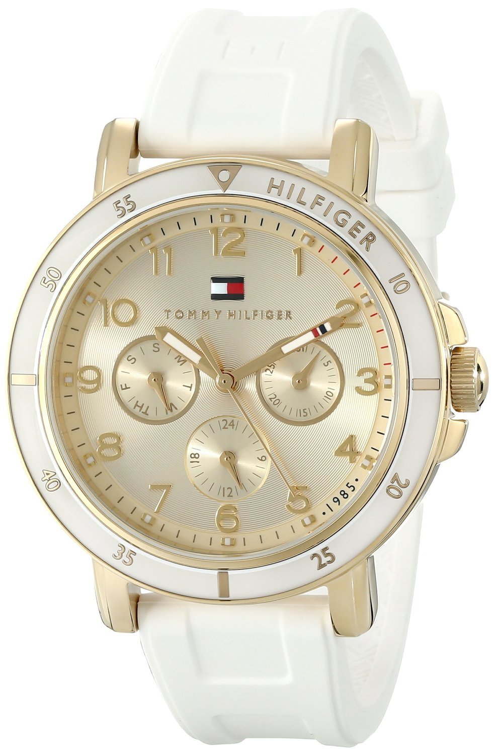 Tommy Hilfiger női óra, tok anyaga nemesacél, színe arany, a szíj anyaga kaucsuk és a színe fehér. Az óratok átmérője 38mm, üvege ásványi kristály, szerkezete kvarc és vízállósága 30 m. Az órára 2 év magyar és nemzetközi garancia érvényes.