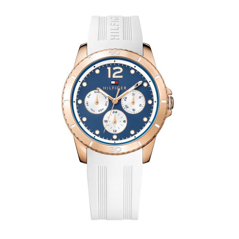 Tommy Hilfiger női óra, tok anyaga nemesacél, színe arany, a szíj anyaga kaucsuk és a színe fehér. Az óratok átmérője 38mm, üvege ásványi kristály, szerkezete kvarc és vízállósága 30 m. Az órára 2 év magyar és nemzetközi garancia érvényes.