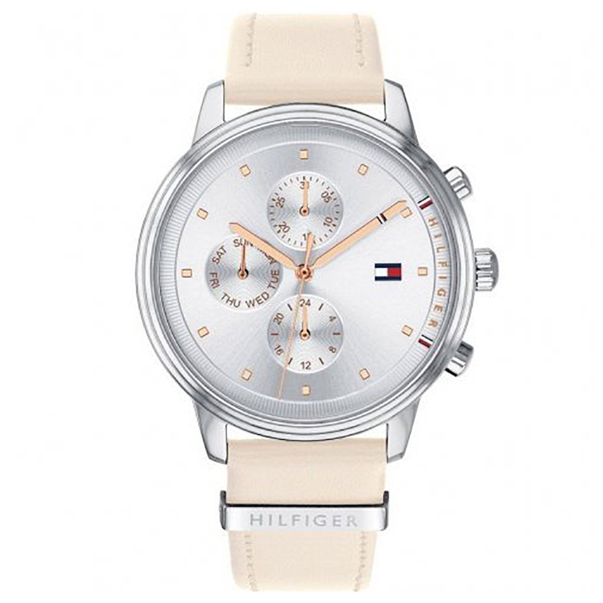 Tommy Hilfiger női óra, tok anyaga nemesacél, színe ezüst, a szíj anyaga bőr és a színe bézs. Az óratok átmérője 38mm, üvege ásványi kristály, szerkezete kvarc és vízállósága 30 m. Az órára 2 év magyar és nemzetközi garancia érvényes.